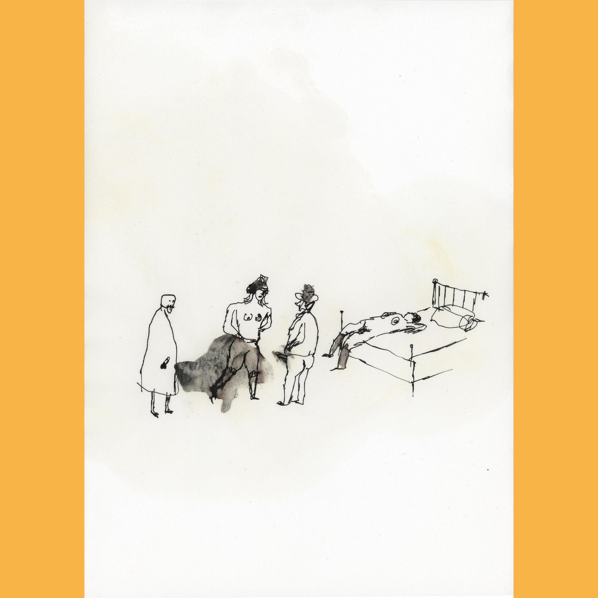 Dibujo para el libro historia abreviada de la literatura portátil, de Enrique Vila-Matas, ed. Libros del Zorro Rojo. Tinta y aceite de oliva sobre papel, 21 x 29,5 cm.